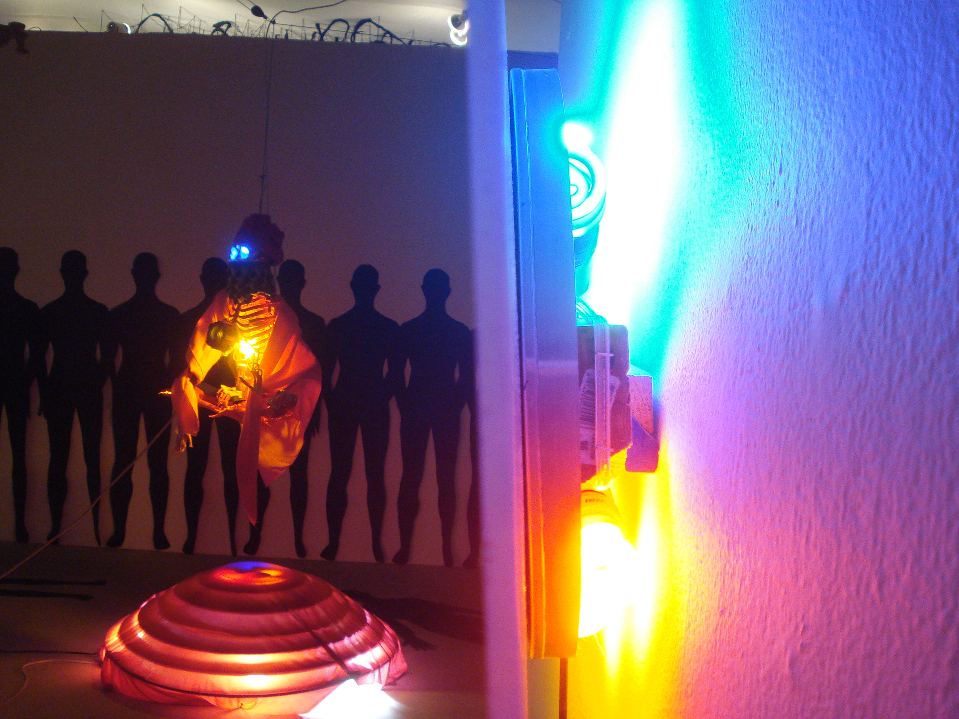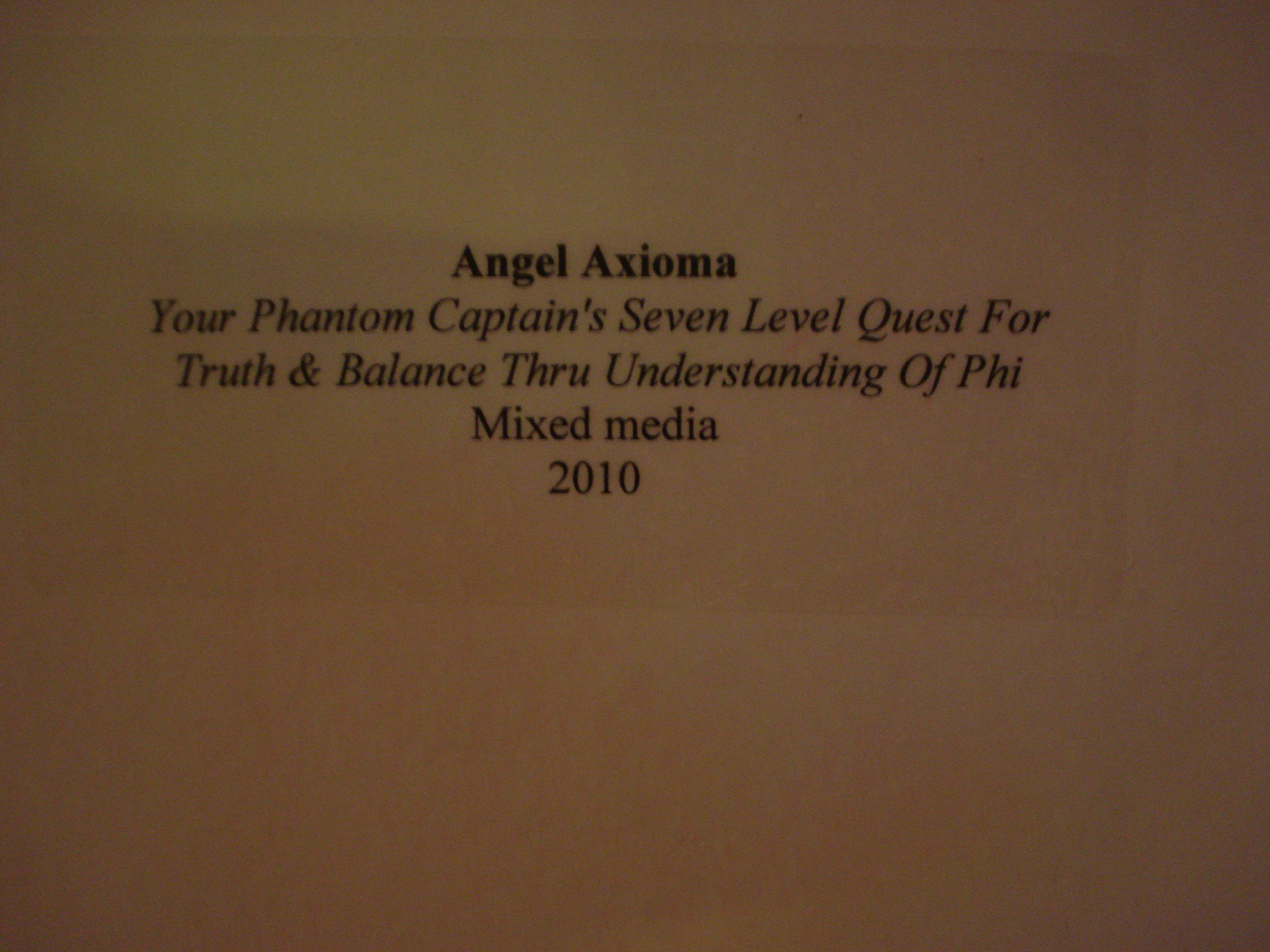 In 2010, "Your Phantom Captain's Seven Level Quest for Truth & Balance Through Understanding of Phi" was a pivotal installation marking Angel Axioma’s exploration of consciousness, truth, and balance through the material world. This work delves into the mysterious interplay between the mind and body, a topic that remains elusive even to modern science. Inspired by Buckminster Fuller’s metaphor of the "Phantom Captain" controlling the physical body and the ancient Eastern philosophy of chakras, the installation juxtaposes modern existential questions with age-old spiritual inquiries.