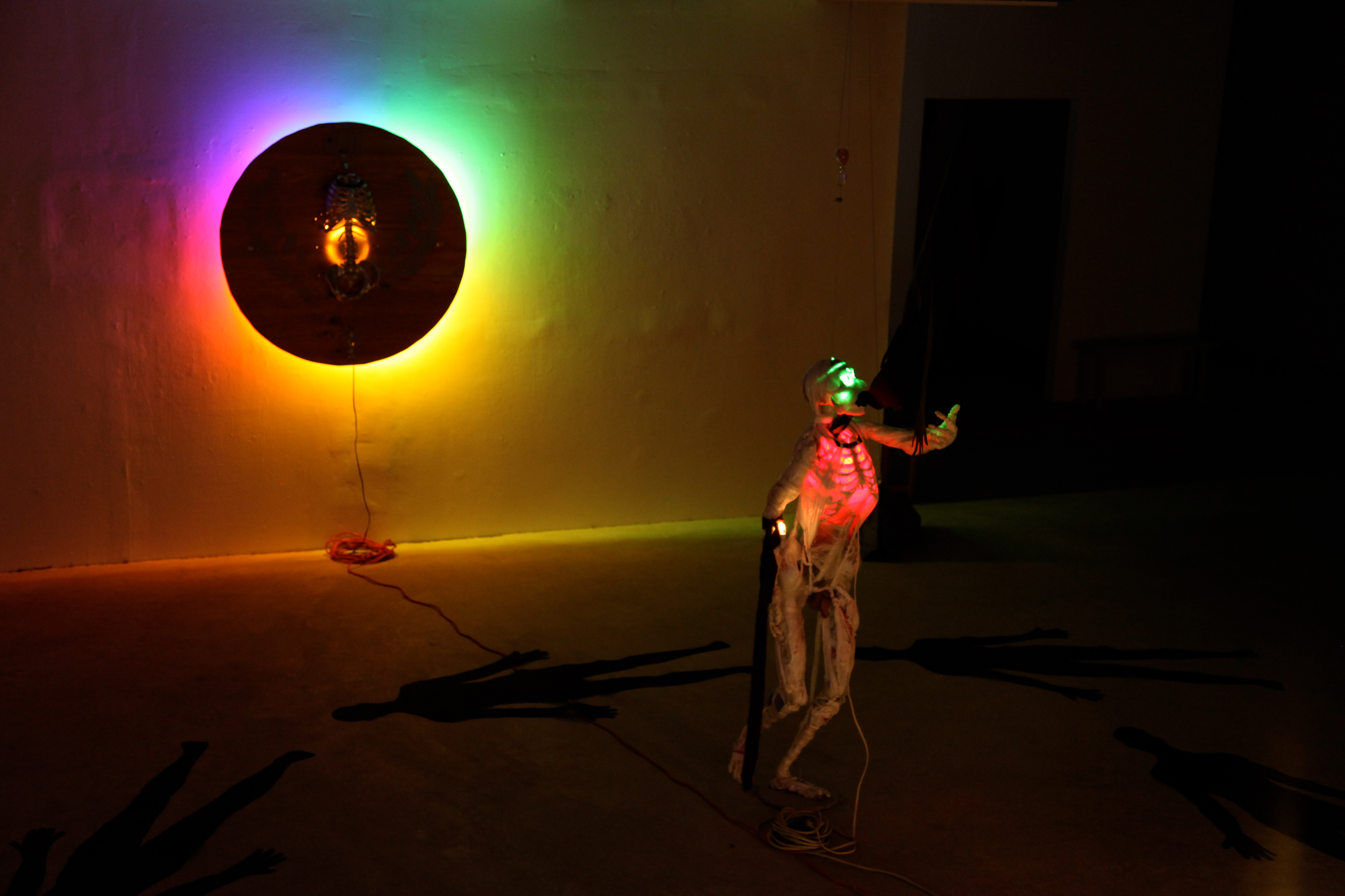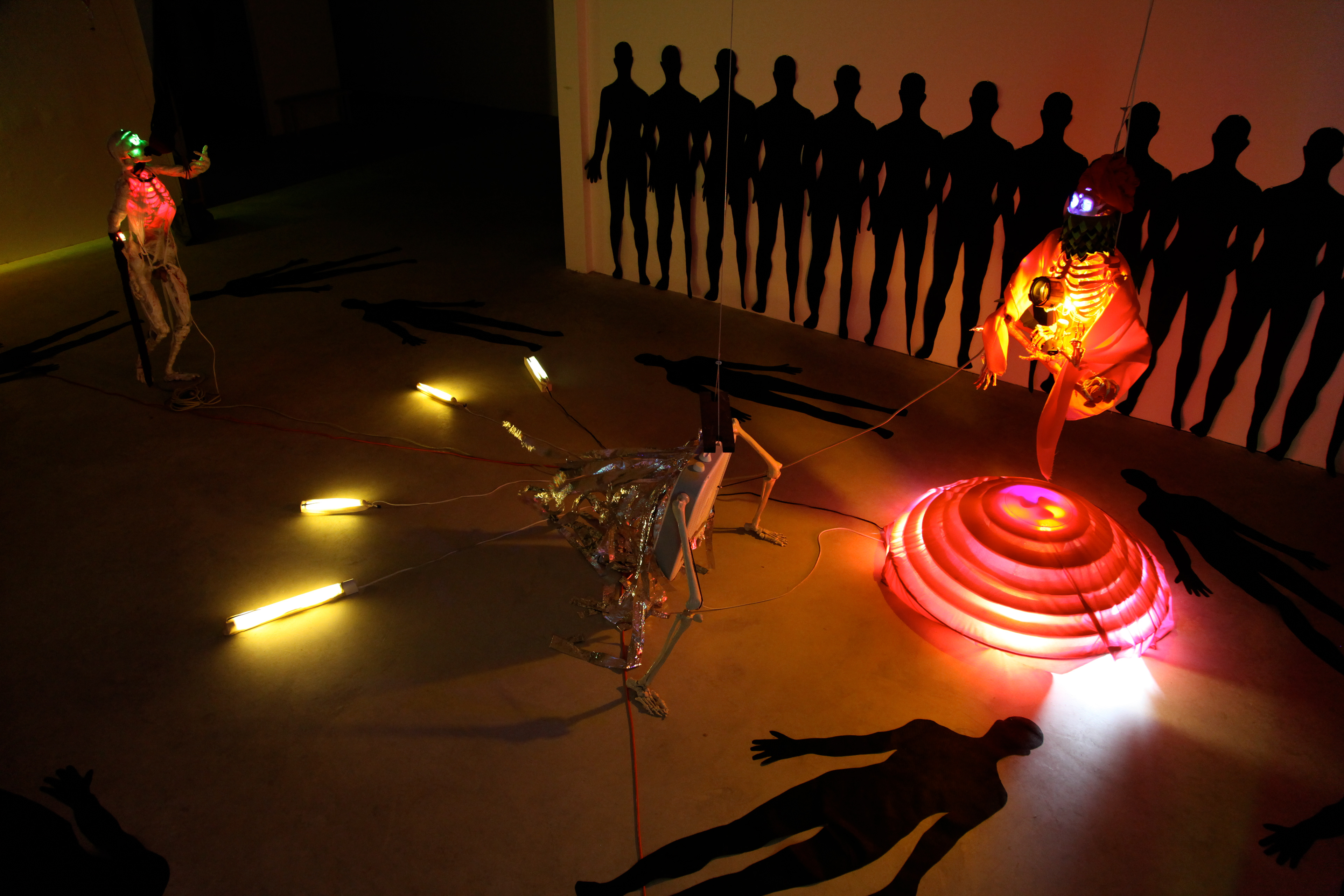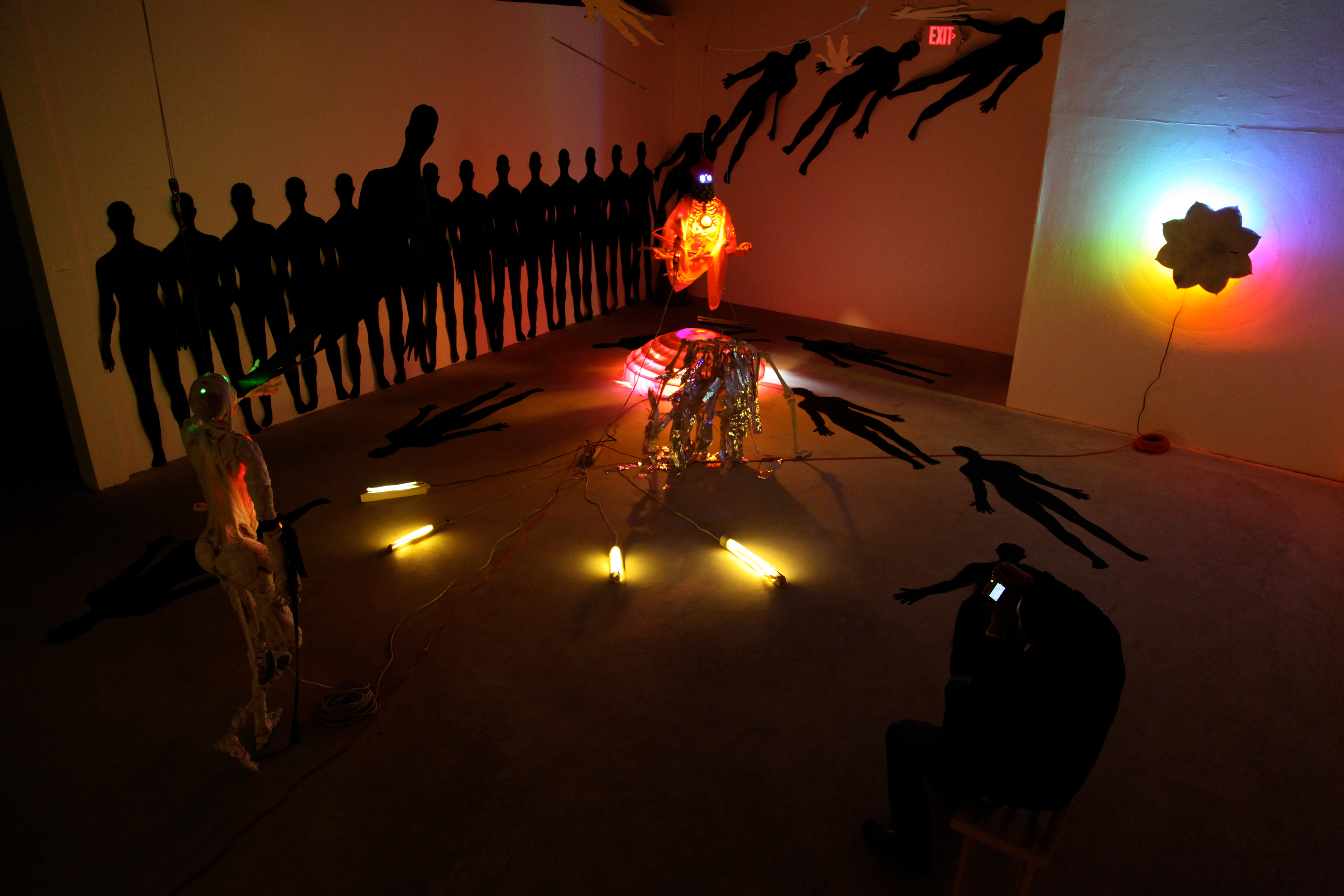Medium: Lights, motors, plastic skeletons, fabric, plastic bags. Variable Sizes: Life-sized figures