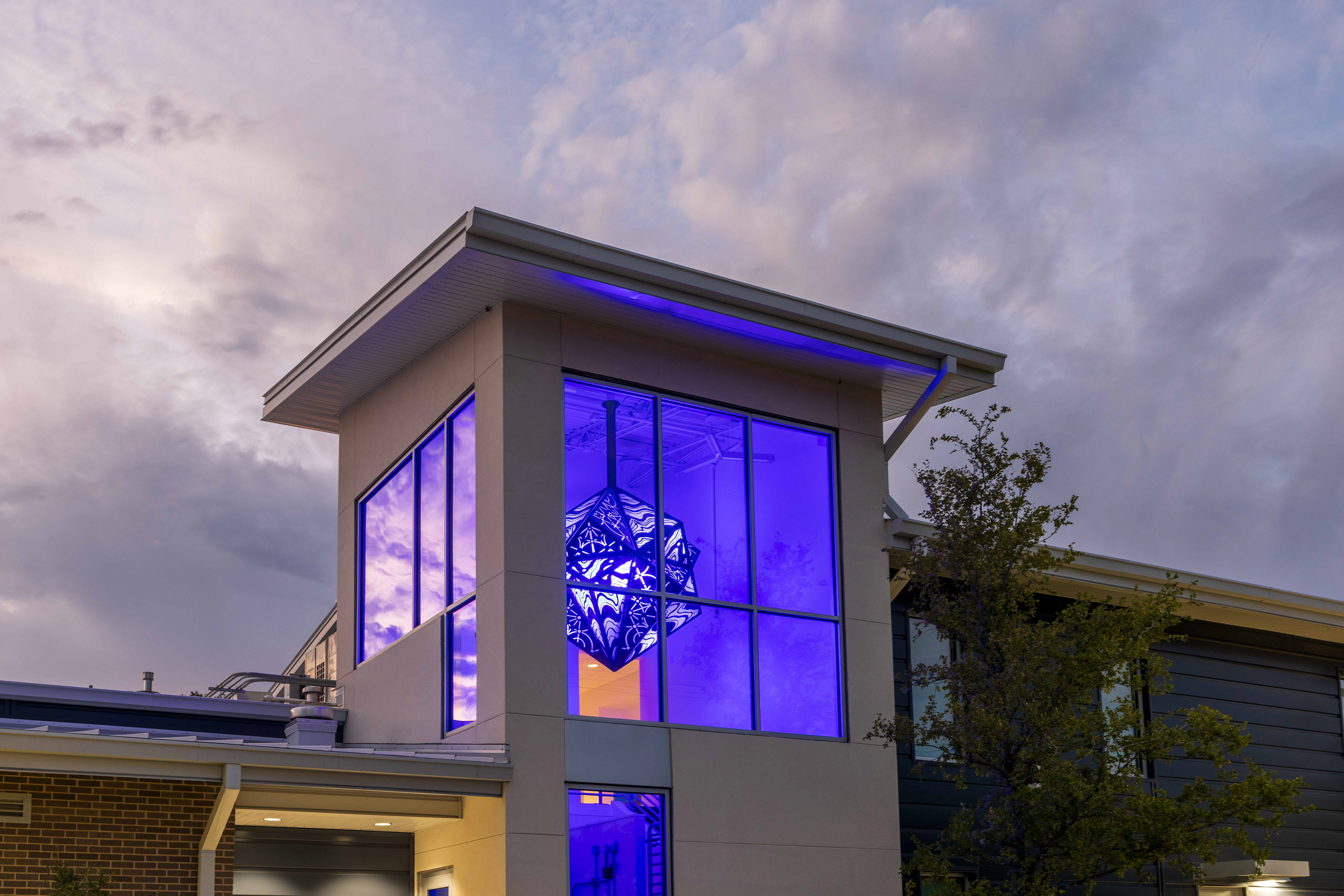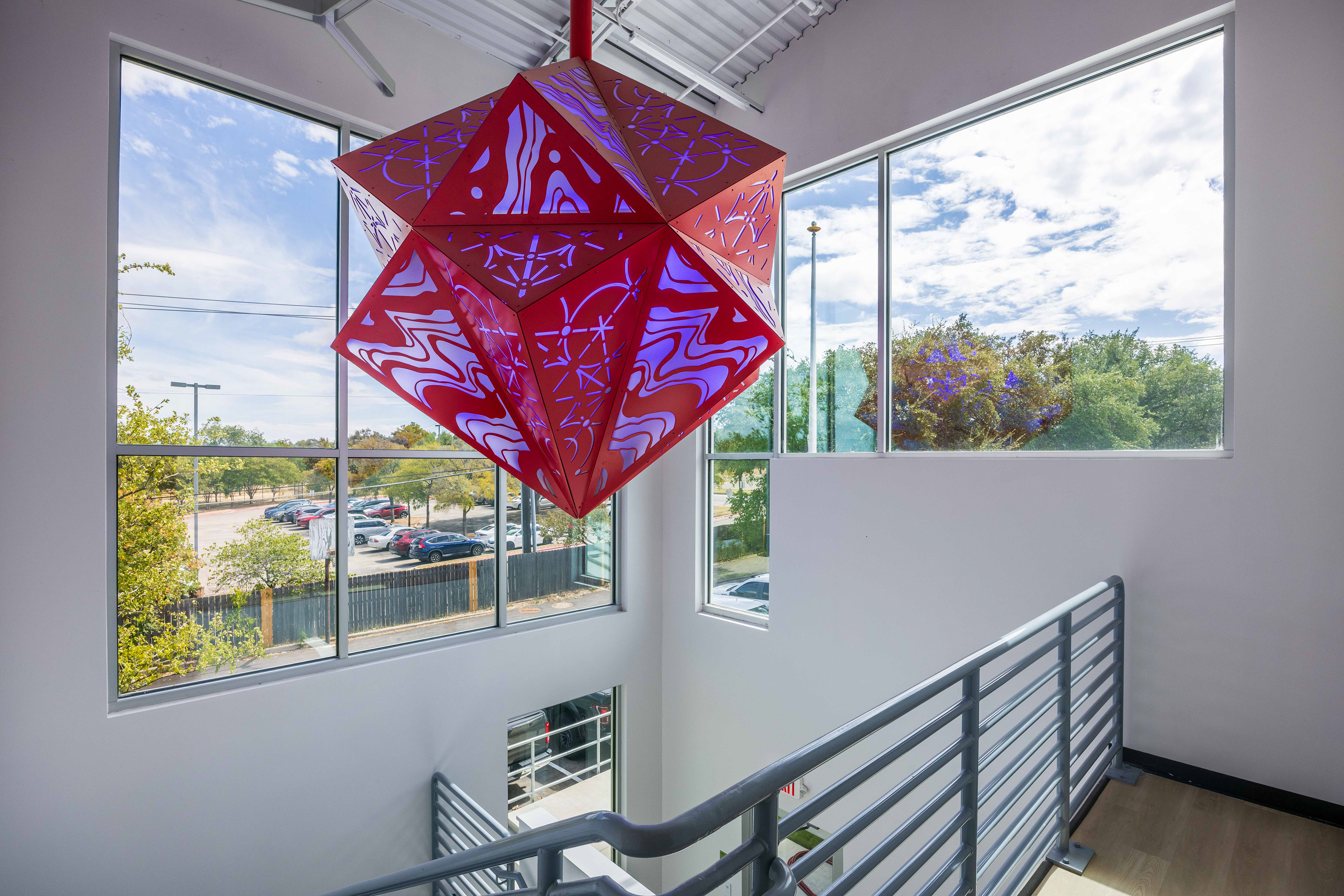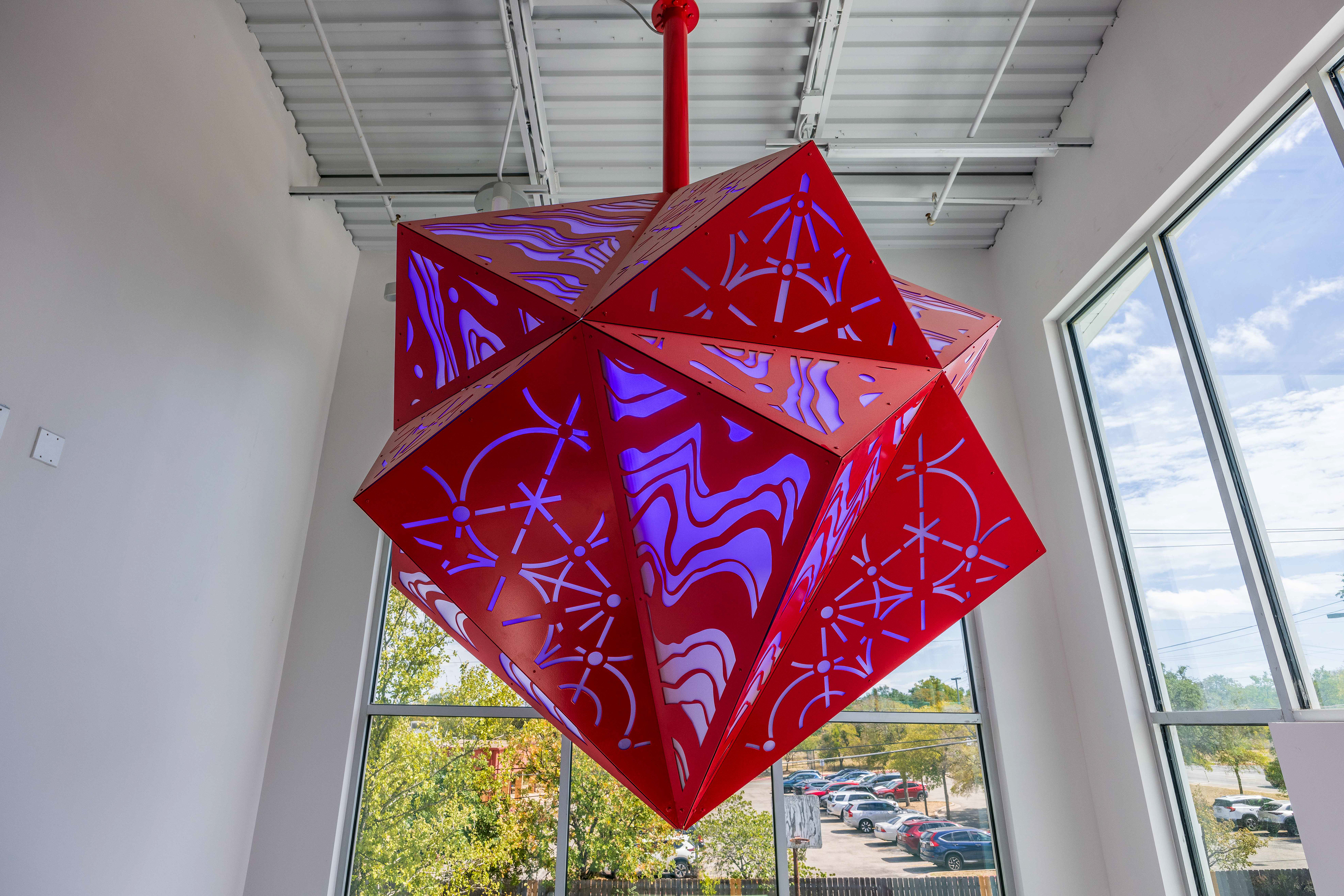 The sculpture site will be in the two-story vestibule public entrance of the new station. It will be suspended about 13.5’ ft from the ground and hanging about 5.6’ ft from the lowers part of the pitched ceiling. The artwork will be visible from the Duval Rd. facing window, which is approximately 12ft by 7ft, and the East facing storefront window which is approximately 12ft by 12 ft. The placement of will be centered north & south and slightly closer to the east-facing window, allowing it to be seen from the outside of the building.