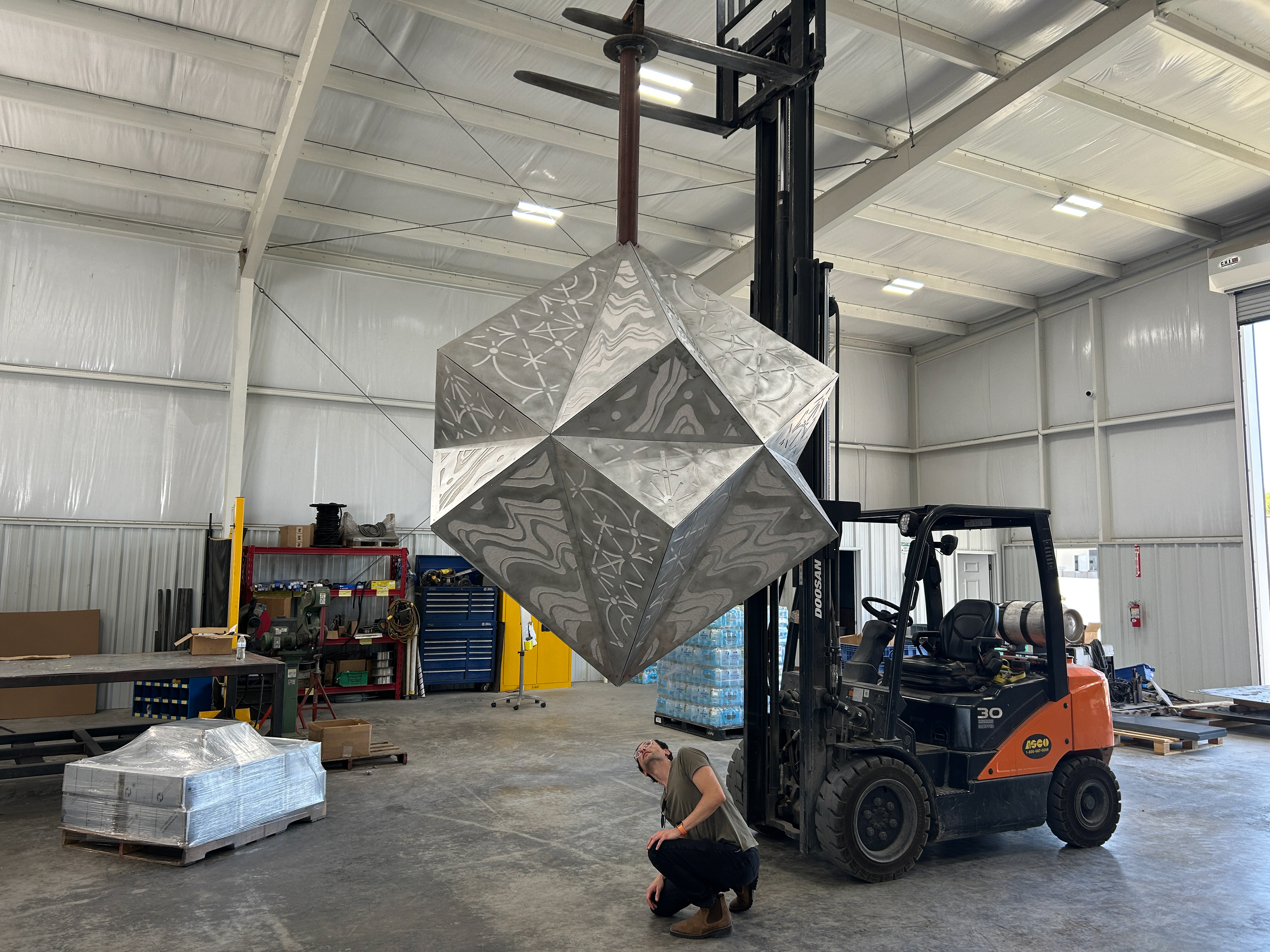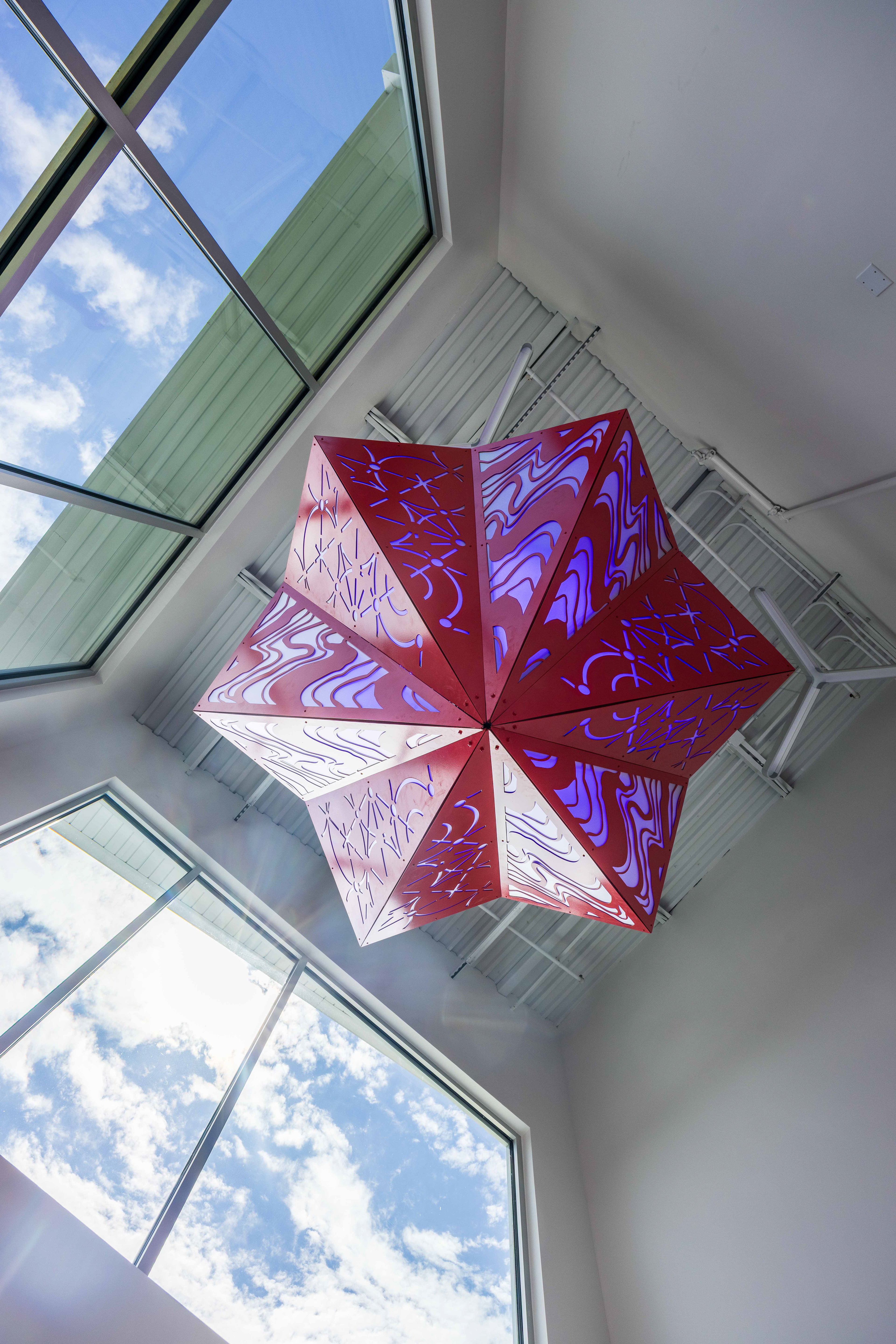 I have designed an indoor hanging lighted sculpture that is about 7ft in diameter. I will be located in the entrance atrium. It’ll essentially and large aluminum light pendant.